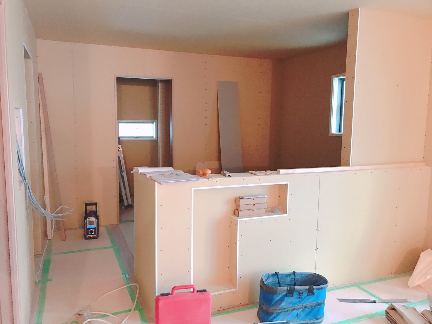 大工の平野さんがキッチンの腰壁を作ってくれています。