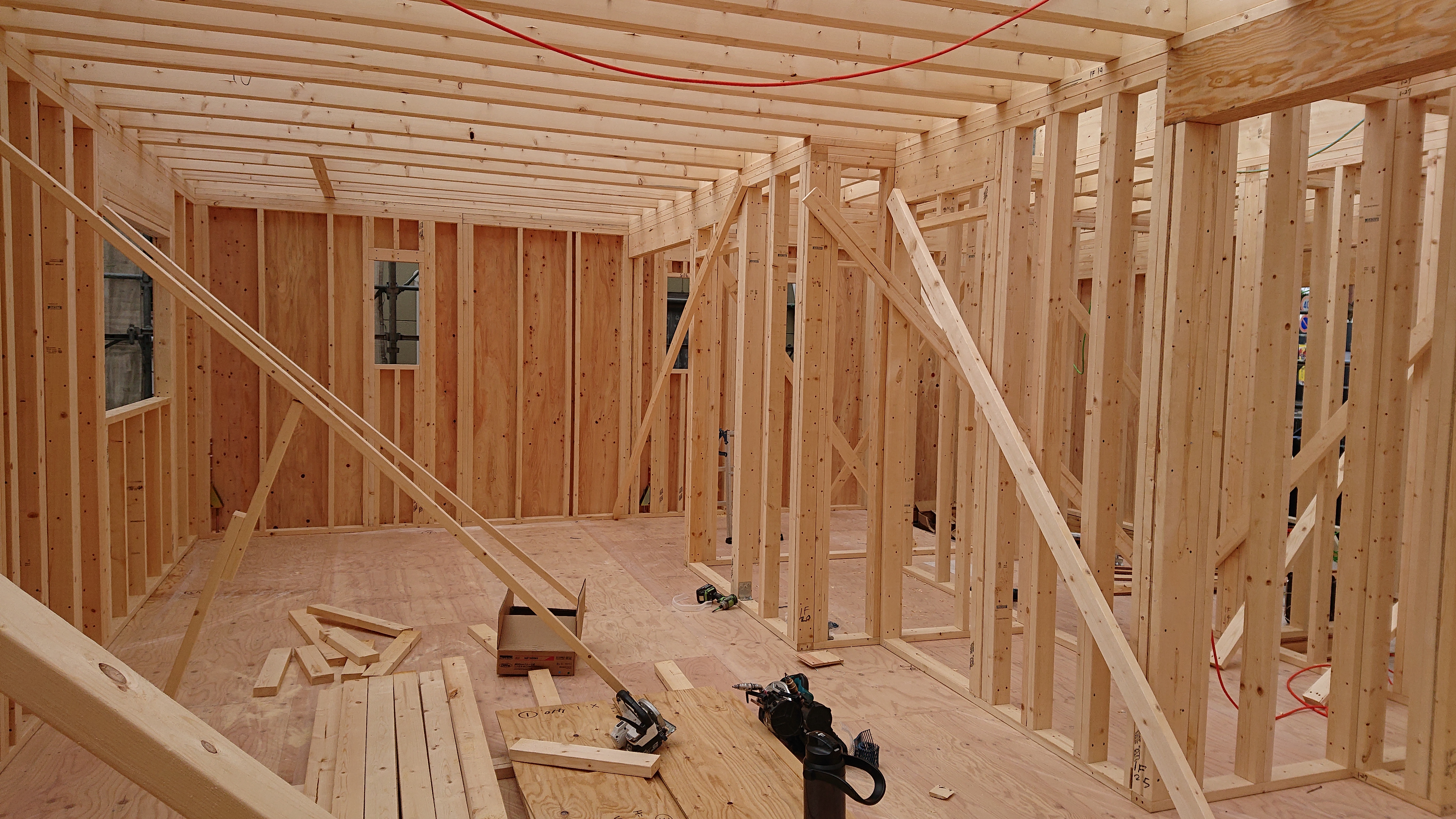 専用の工場で精密に作られた2×4のパネルをクレーンで 吊るして組み上げていきます。