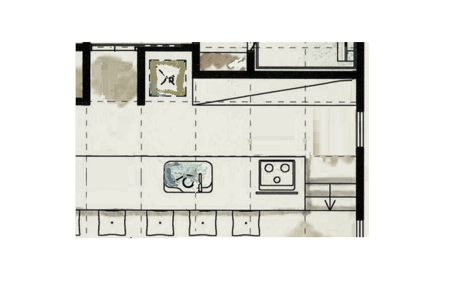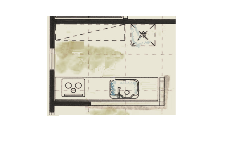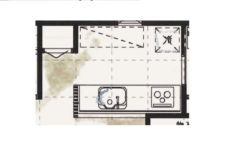 上の図面は、冷蔵庫の奥行きの分、壁を凹ませたキッチンの図面です。