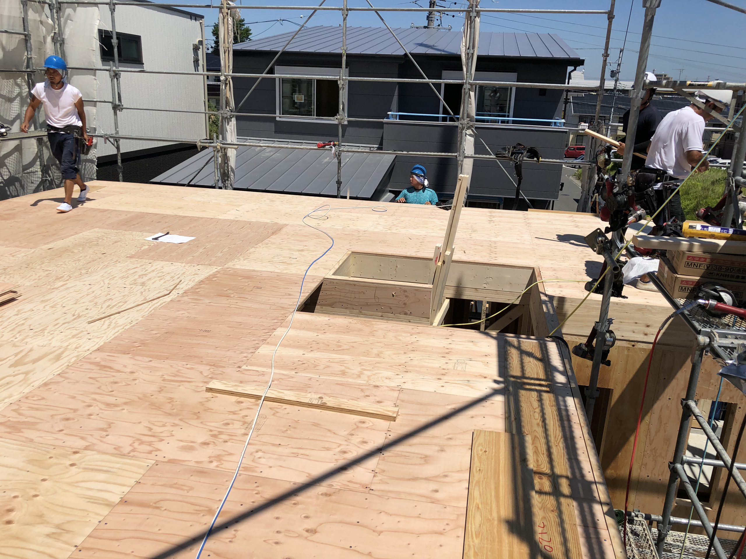猛暑の中にもかかわらず大工さんたちが手際よく作業をしてくれたので、無事予定通り屋根部分まで工事を進めることができました。