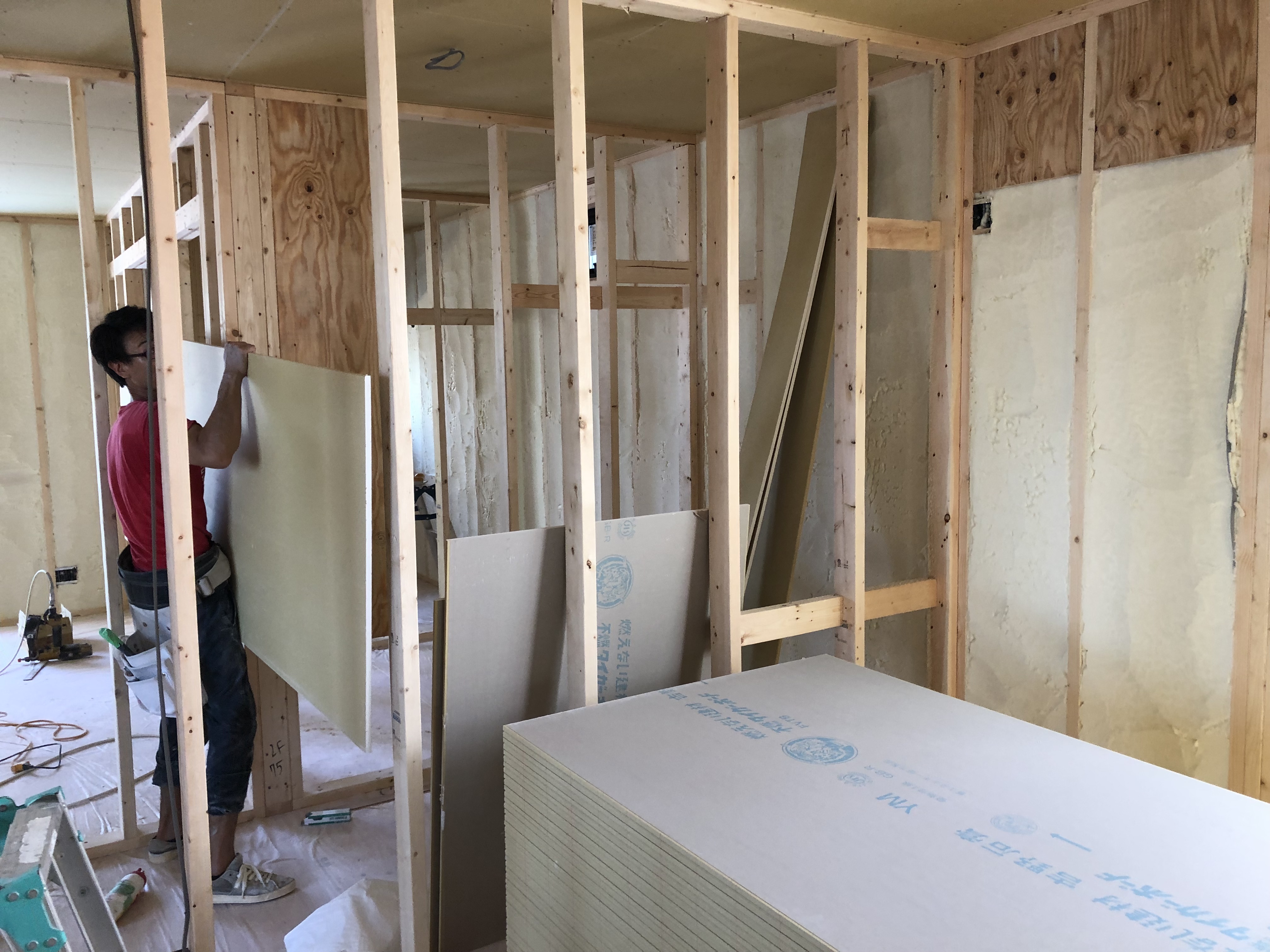 その後は断熱材を吹き付けて、大工の平野さんがパネルを貼ってくれています。