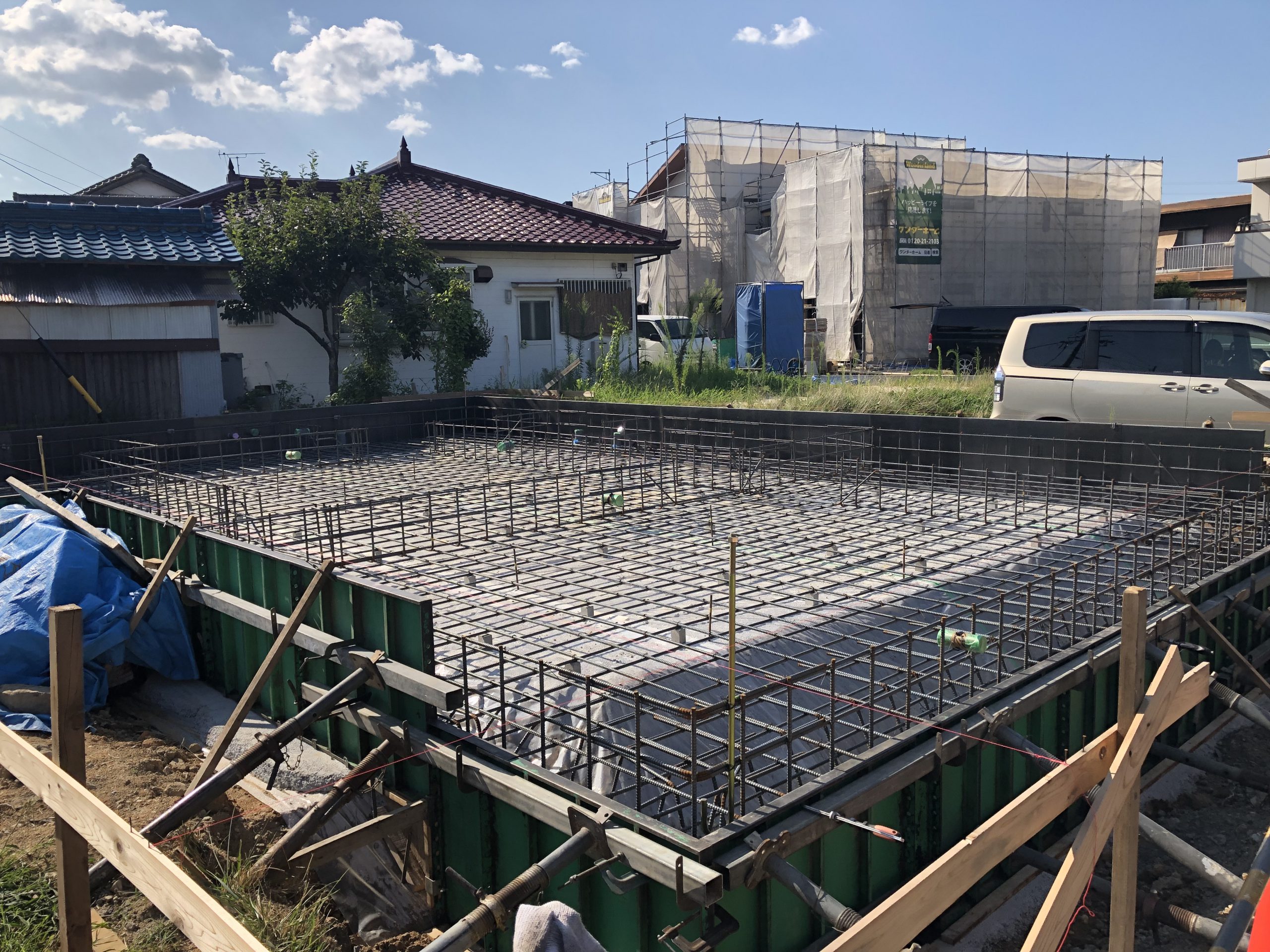 更にそこから基礎の鉄筋を組み、コンクリートを打設するところまで進んでいます。