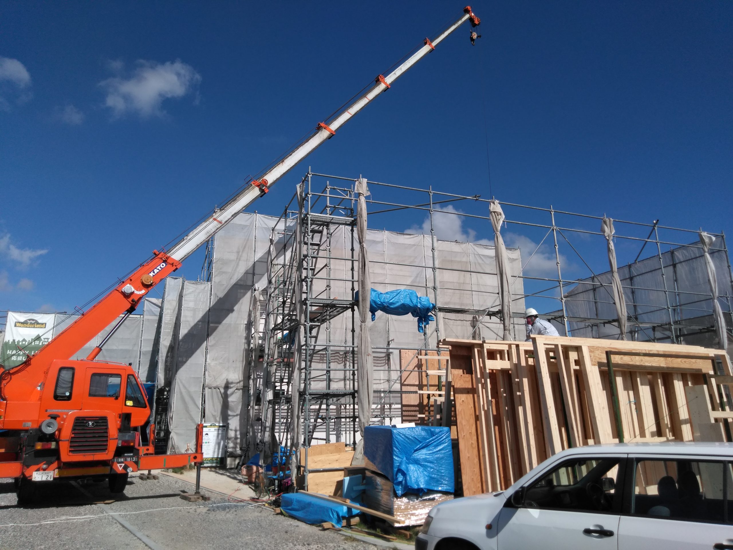 A様の現場では基礎工事が終わり、建方工事が行われました。
