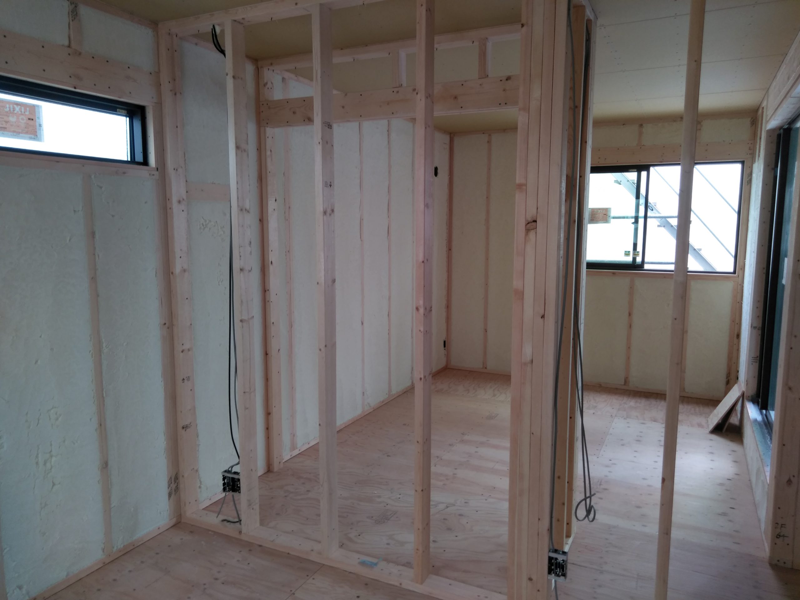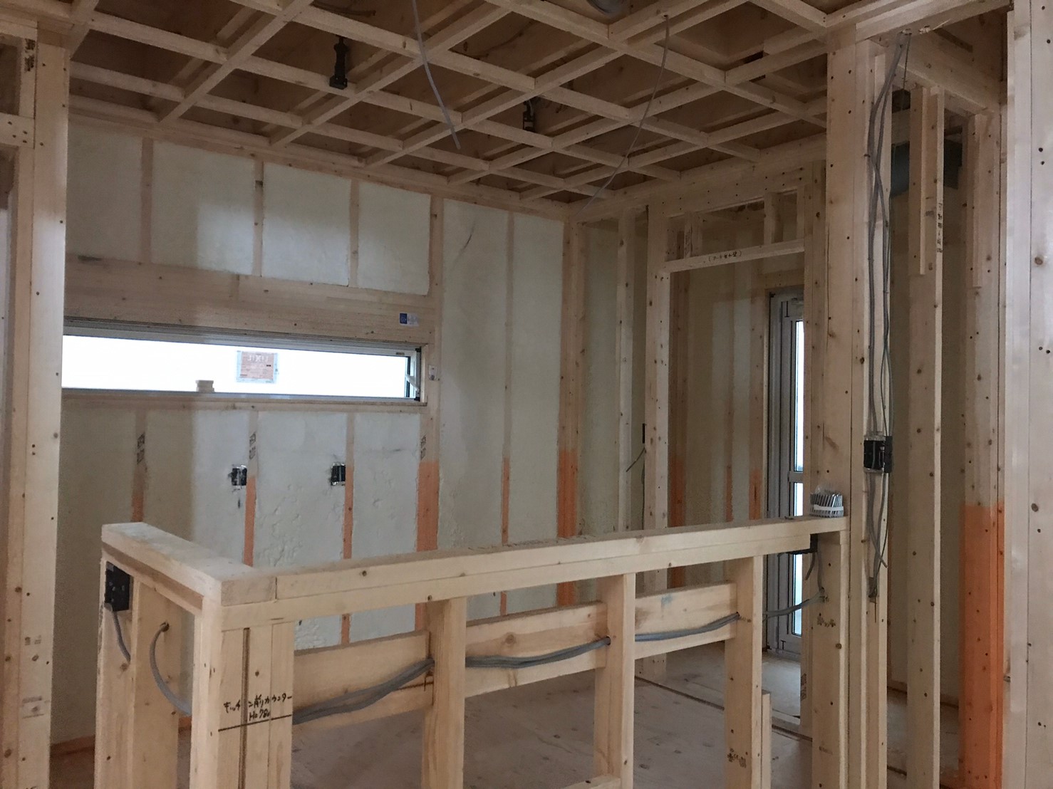 建方工事から少しして吹付け断熱の工事も終わりました。
