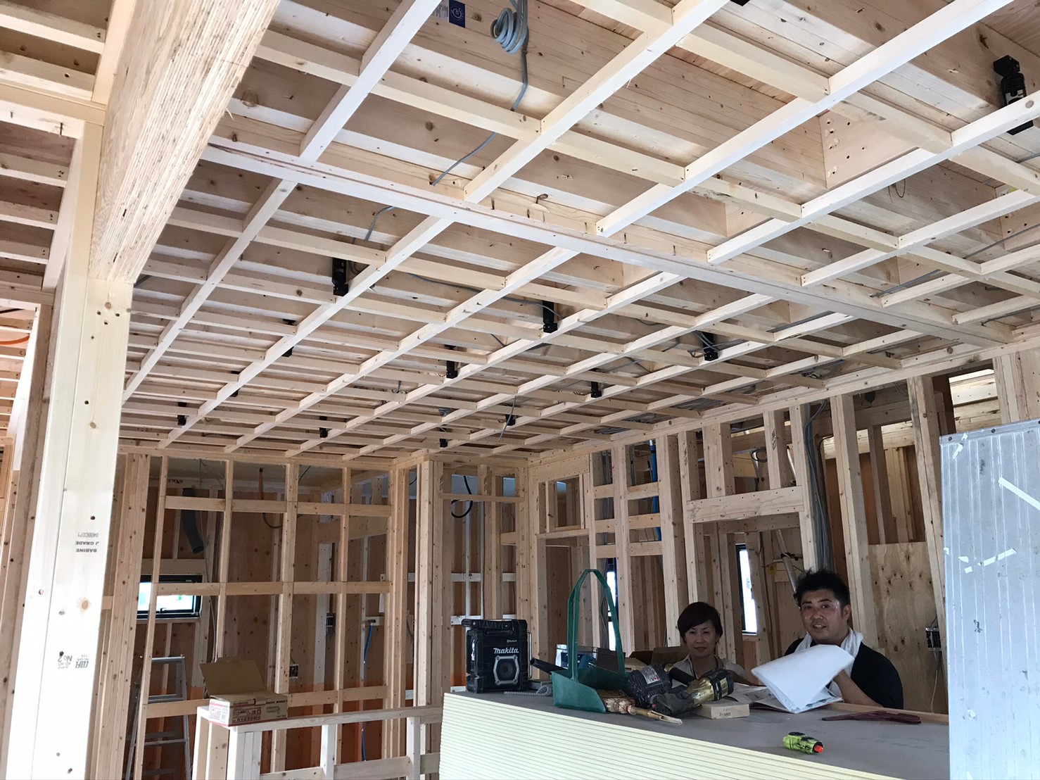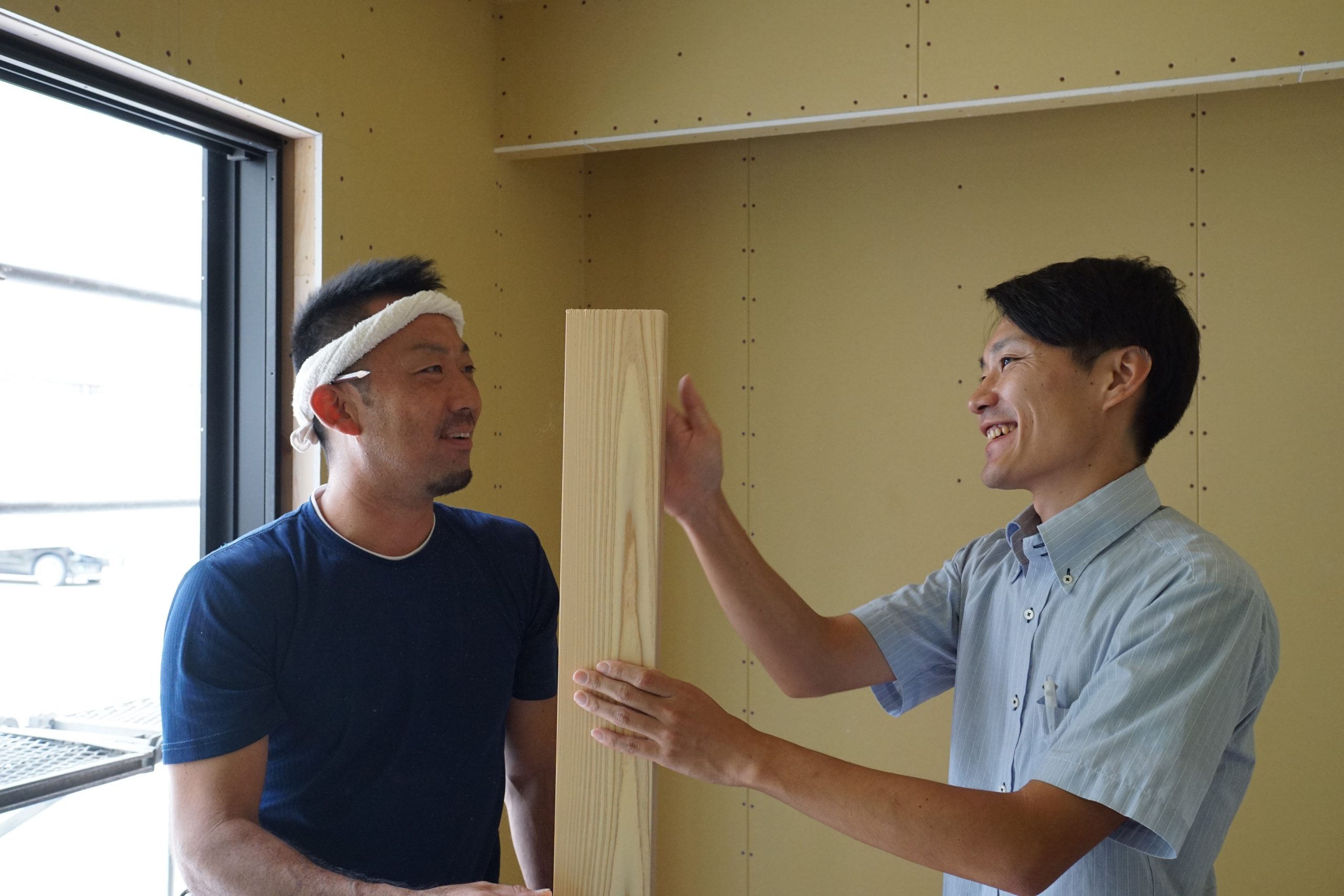 上棟後には現場にて設計の戸来さんと大工の立野さんが細かな部分を打合せ。