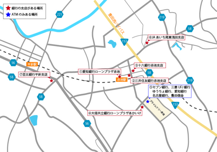 また、プライムツリー赤池(グランドゲート側)の向かいには、④大垣共立銀行(徒歩7分)、⑤プライムツリー赤池内(徒歩8分)内には、セブン銀行、三菱UFJ銀行、ゆうちょ銀行、愛知銀行、名古屋銀行、豊田信金のATMがあります。