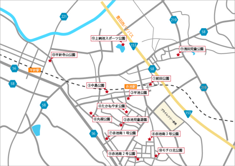 赤池駅周辺には多数の公園があり、設置されている遊具も多いことから、周辺の公園一覧を上記表にまとめております。この中でも特に広く遊具が充実している公園を4つ紹介いたします。