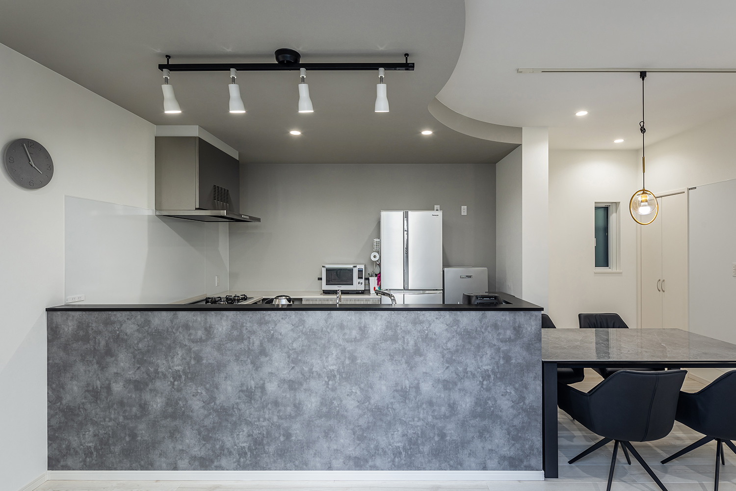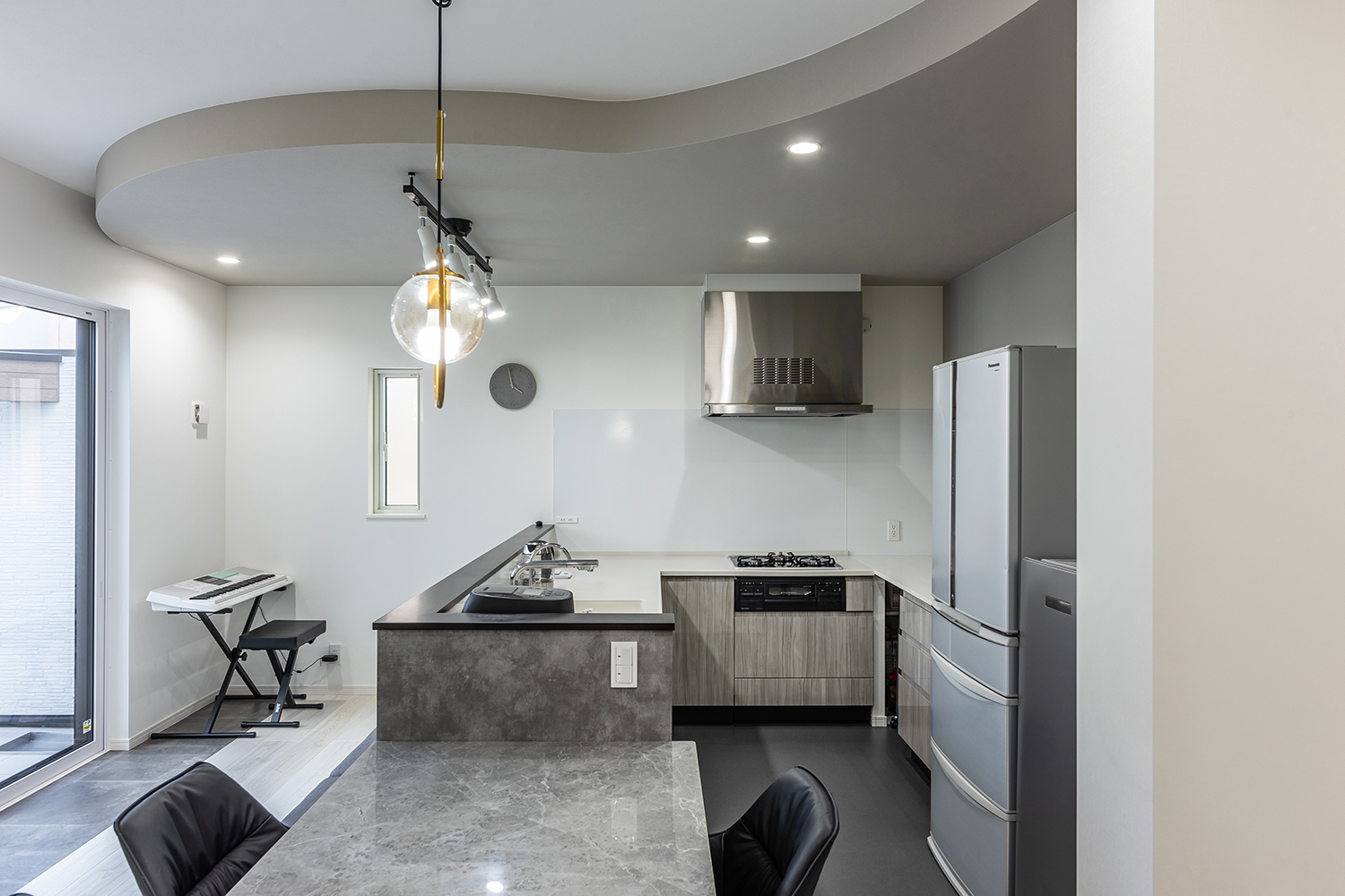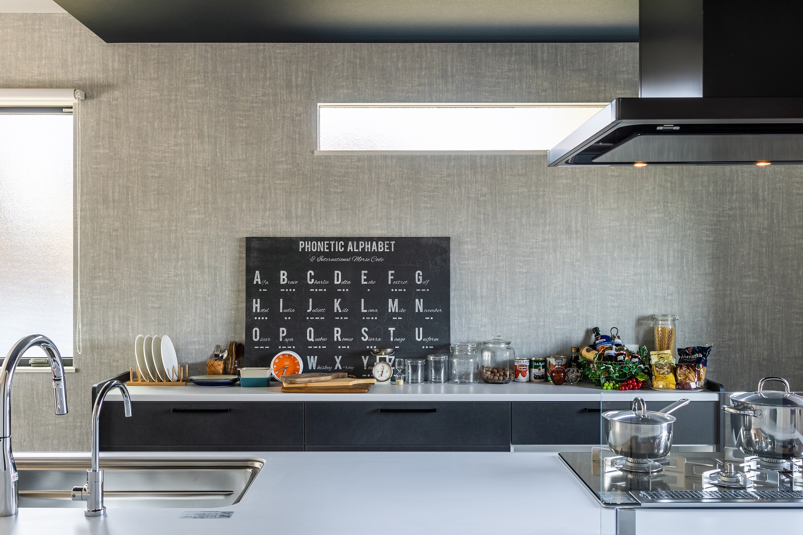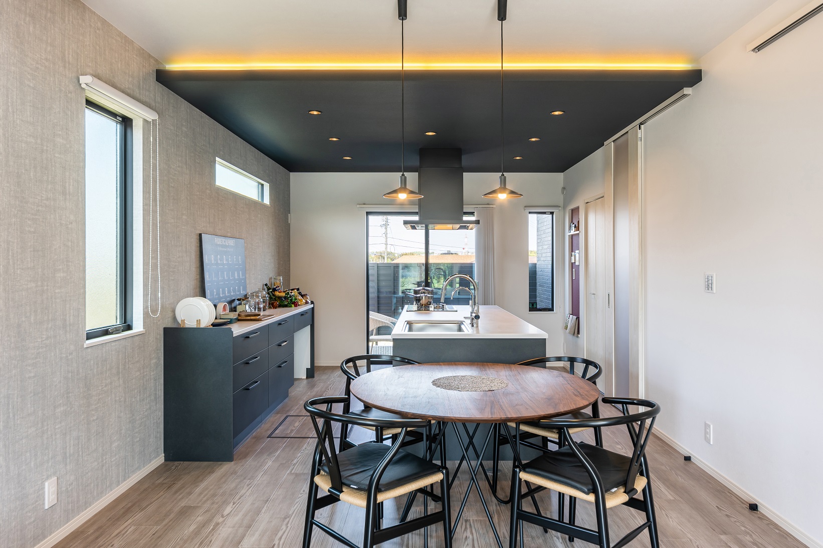 明るく優しい印象のクロスと、腰高のキッチンボードがおしゃれにマッチし、空間をスッキリと見せてくれます。ブラックの折り下げ天井とも相性抜群です。