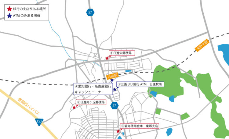 日進駅周辺にある銀行、ATMは全部で5つございます。