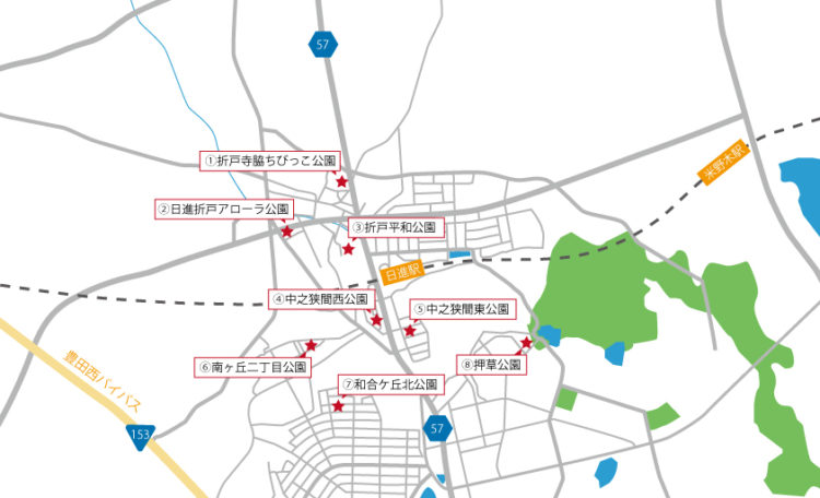 日進駅から徒歩約15分圏内にある公園は全部で8か所ございます。