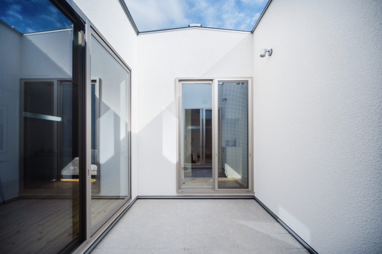 また「中庭」につくった窓には、台風の時のような強風が直接当たることもないし、強風によって何かが飛んできてガラスが割れるような心配もないので、シャッターをつける必要もありません。
