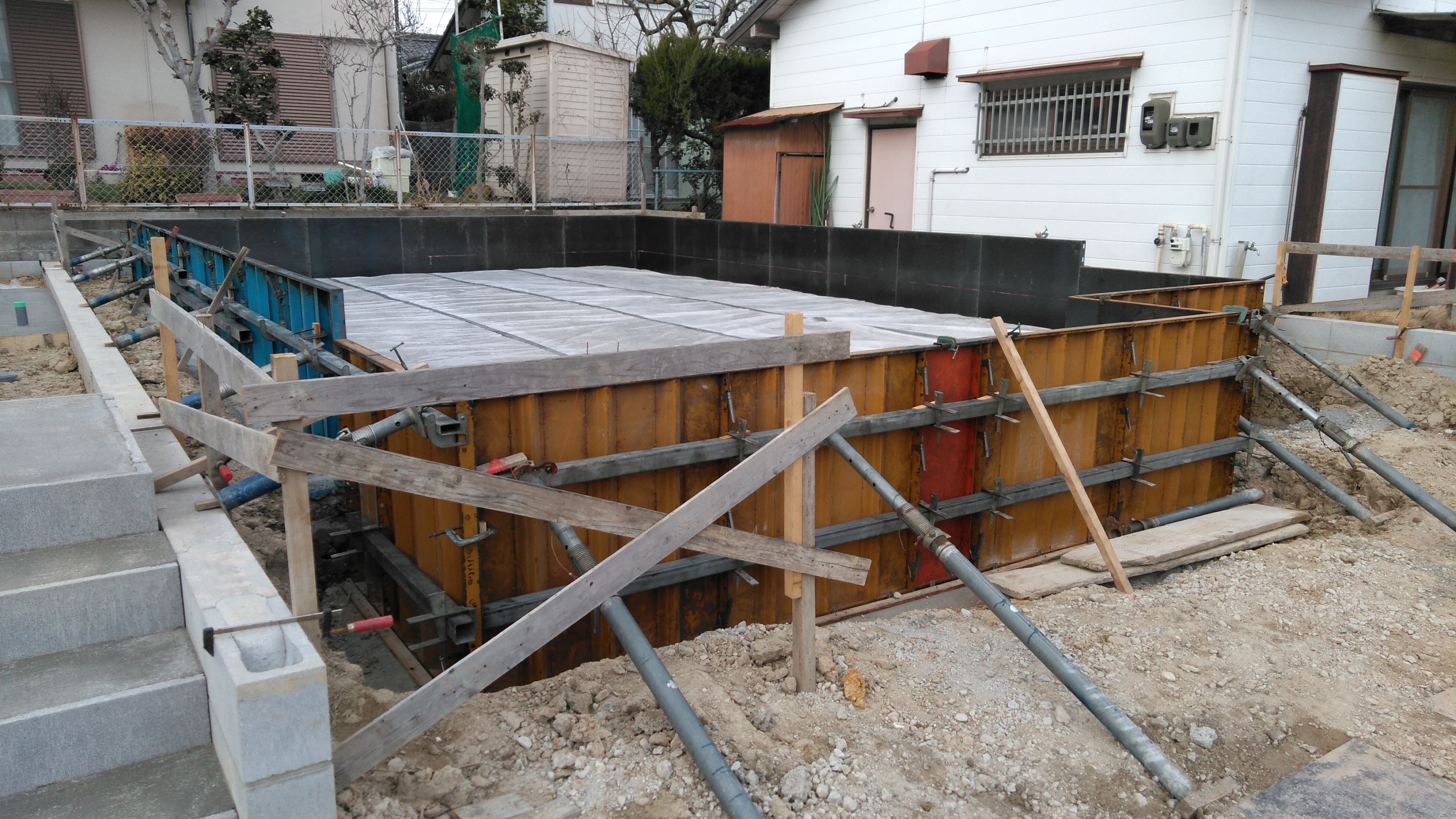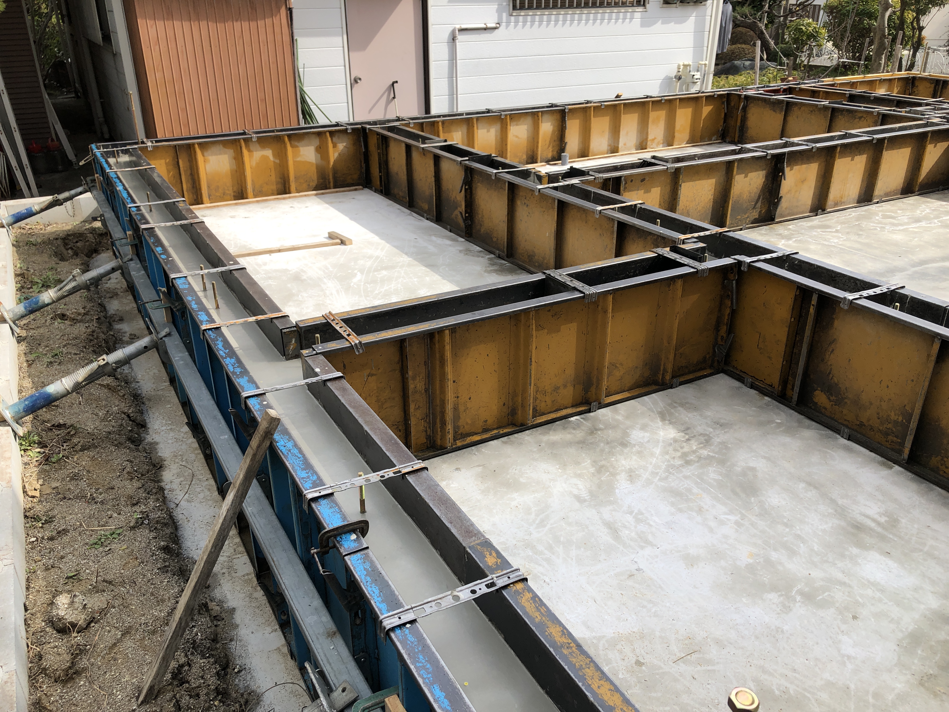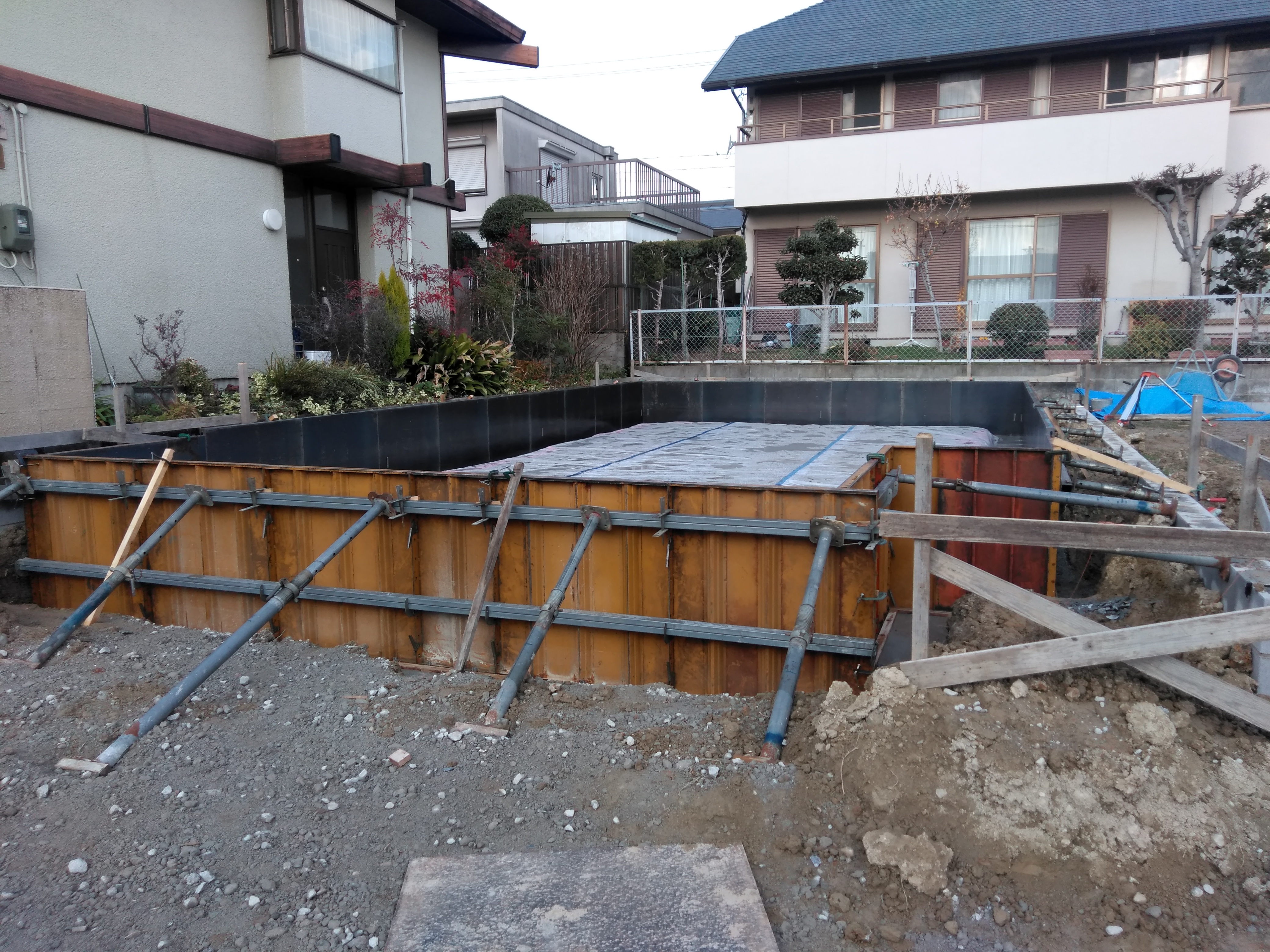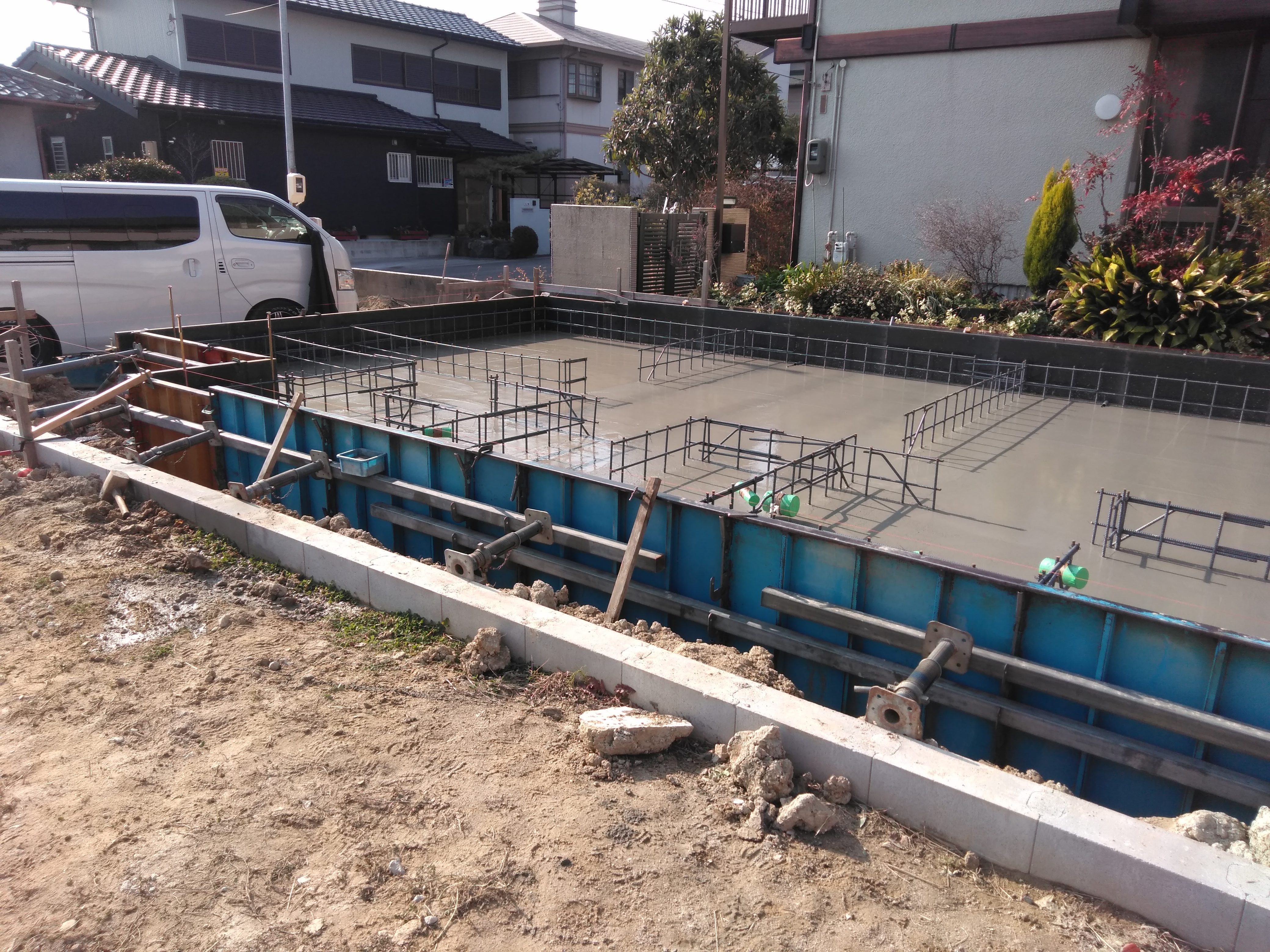 こちらが基礎のベース部分の背筋と型枠を組み、コンクリートを打設したときの写真です。