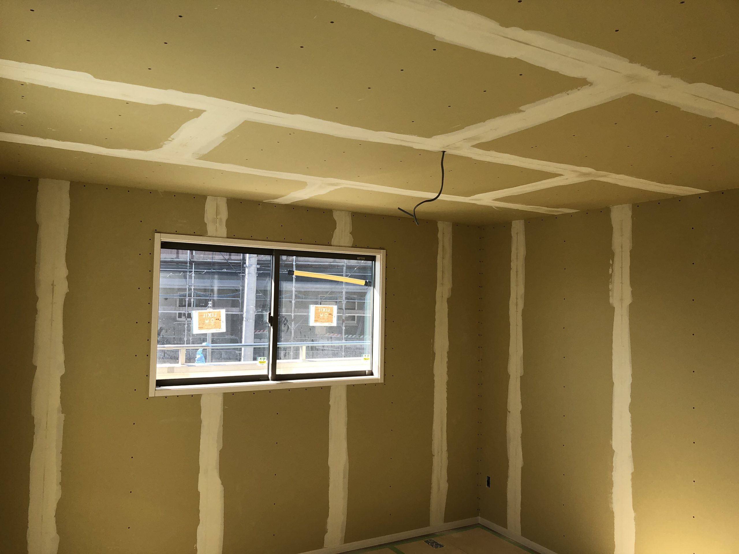そして壁紙をキレイに貼るために、ボードの隙間を埋める下処理をしていきます。