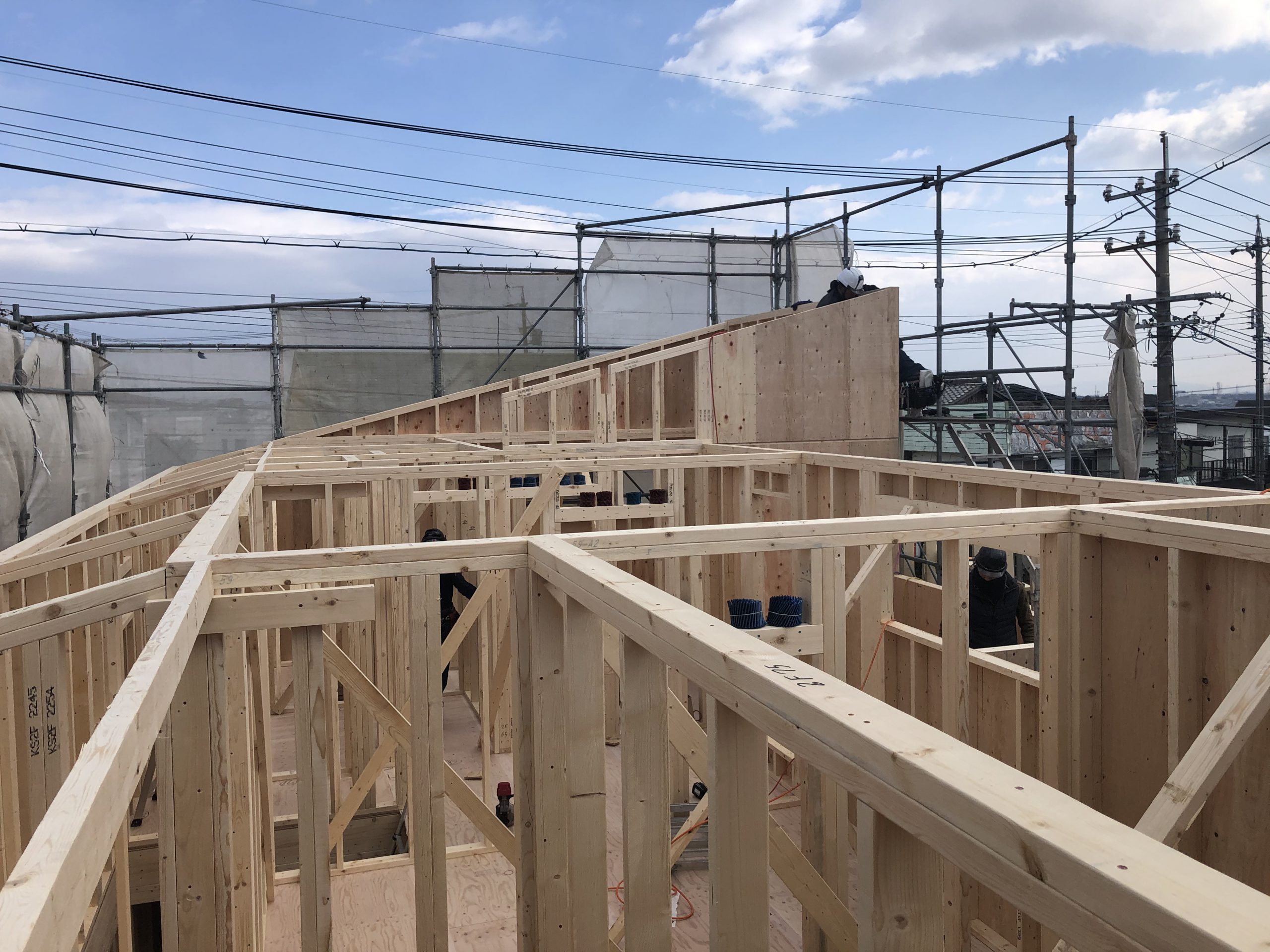 基礎工事の次は、いよいよ棟上げをする建方工事が行われました。
