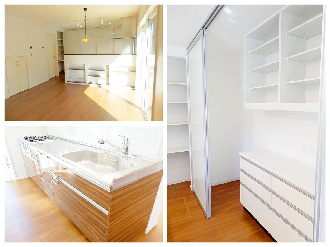 扉で隠せるキッチン収納や階段下収納、玄関から洗面室やキッチンに直接行ける動線など、LDKを自然と綺麗に使うことのできる工夫がいっぱいです。