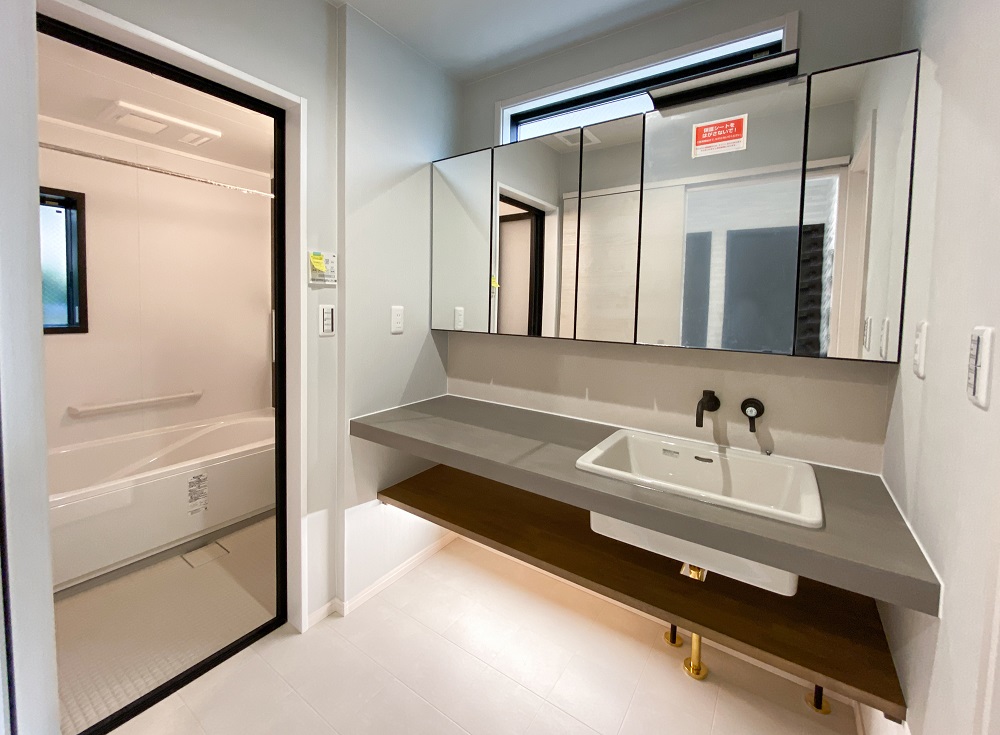 洗面室と浴室はモノトーンで統一されていて、シンプルながらもこだわりを感じる空間となっています。グレーの洗面カウンターや壁いっぱいのワイドミラーも洗練された印象を与えてくれます。