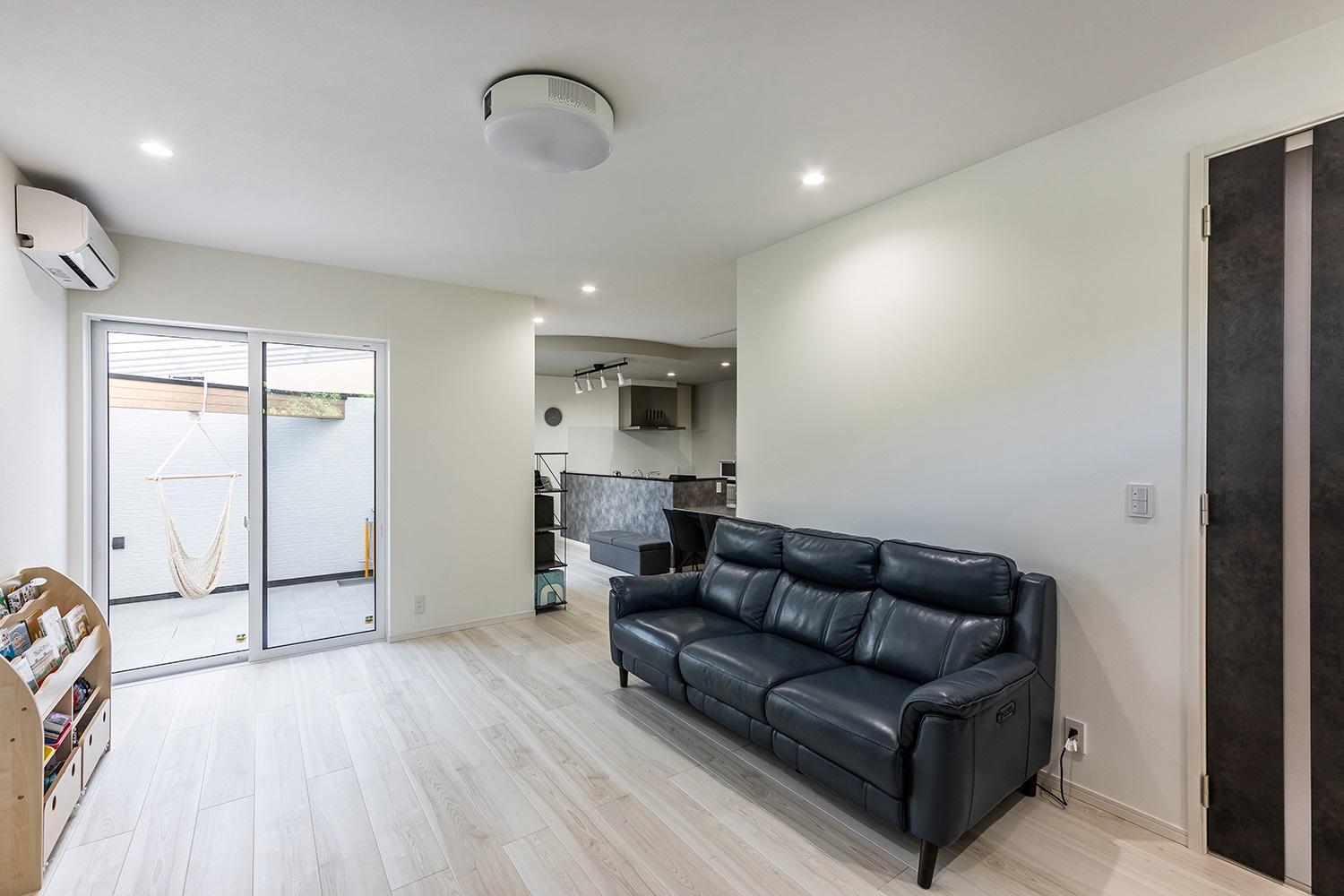 プロジェクター時計や緑が美しいピクチャーウィンドウなど遊び心を取り入れ、居心地の良いリビング空間に仕上げました。