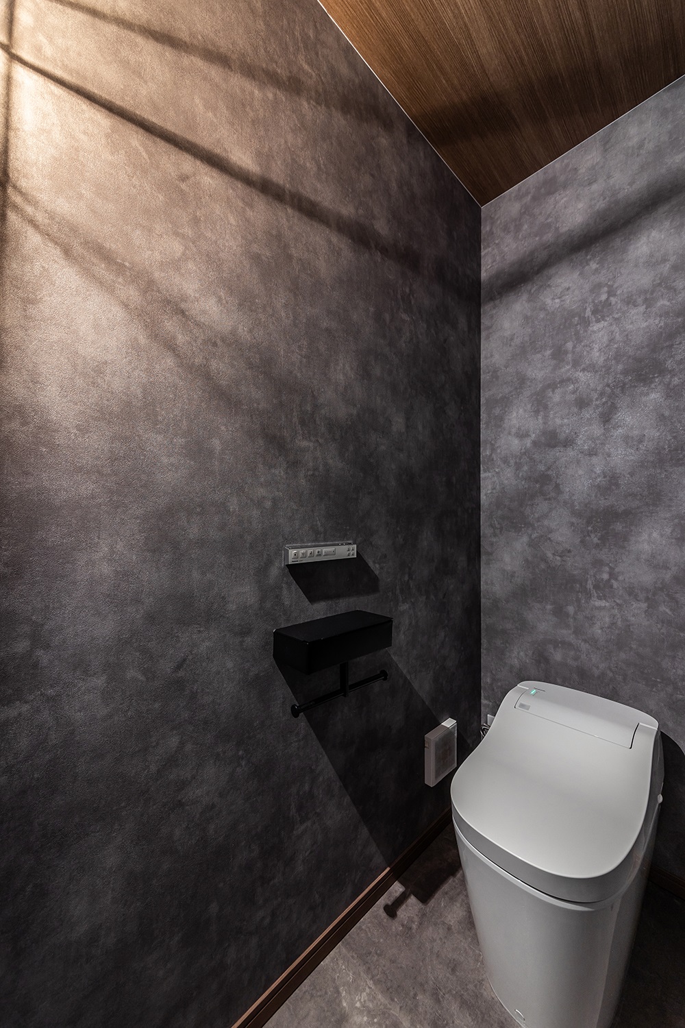 グレーのクロスとフローリングが落ち着いた雰囲気のトイレ。