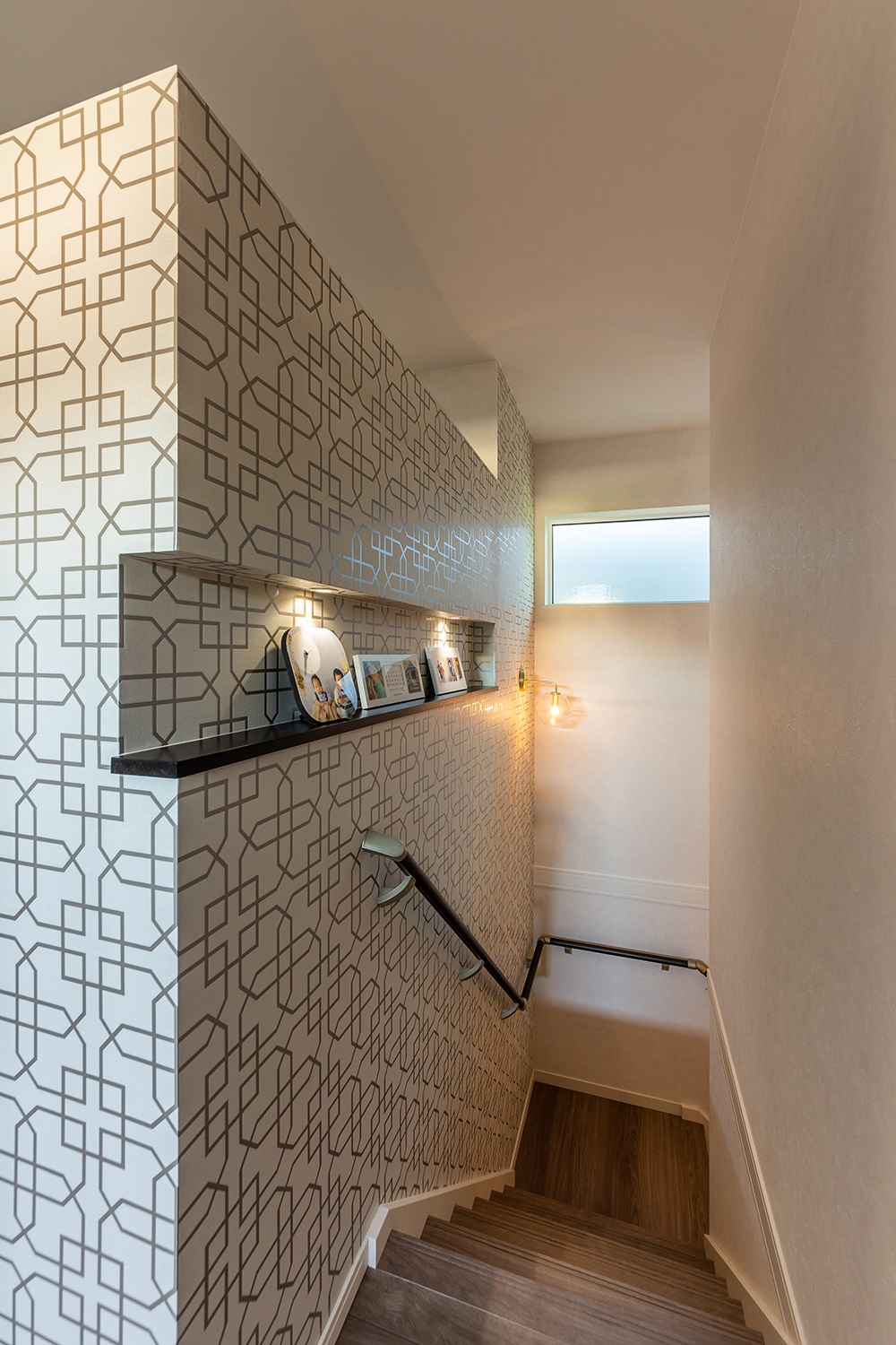 階段横の壁には幾何学柄とメタリックの組み合わせがおしゃれなアクセントクロスを使用し、モダンな雰囲気に。