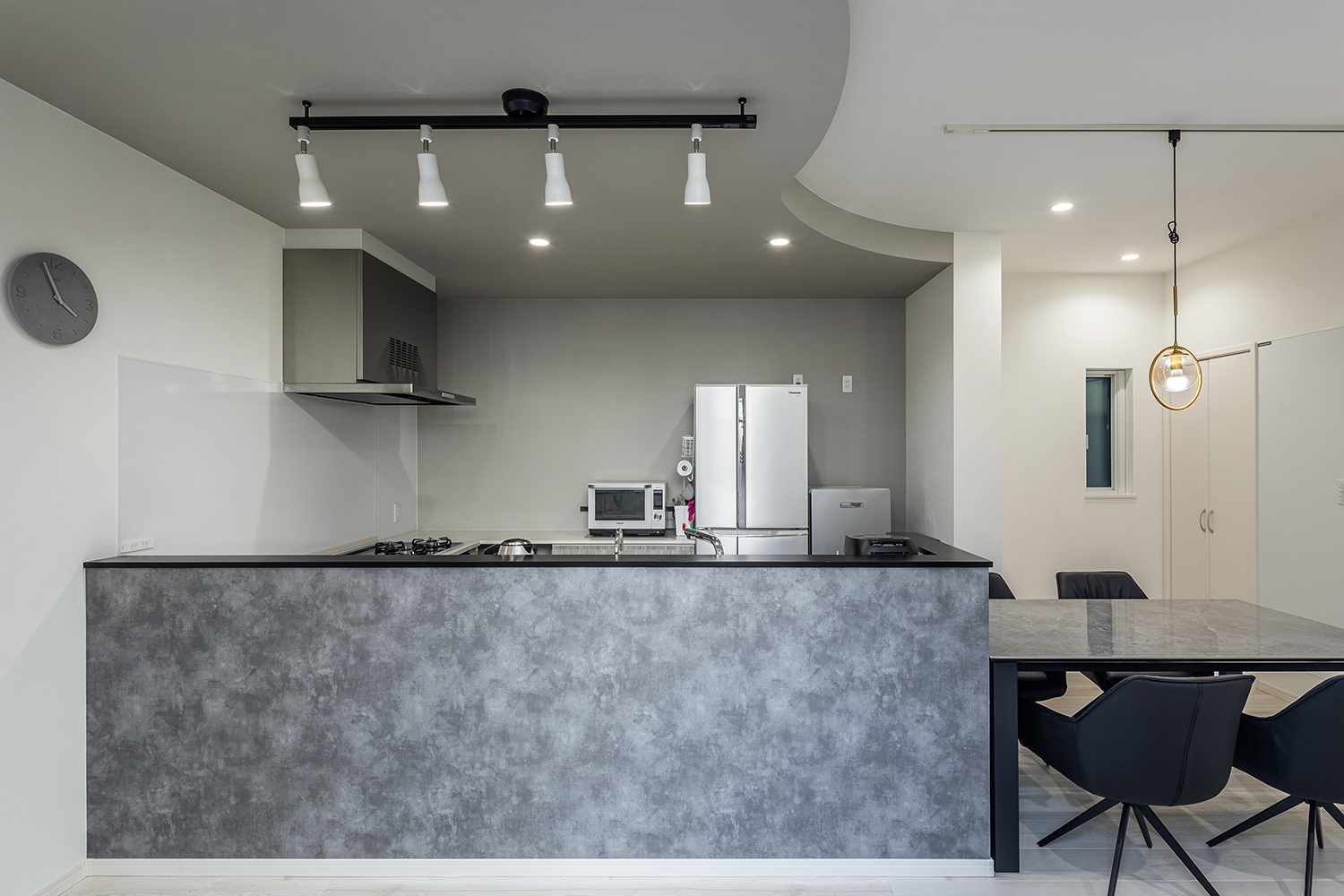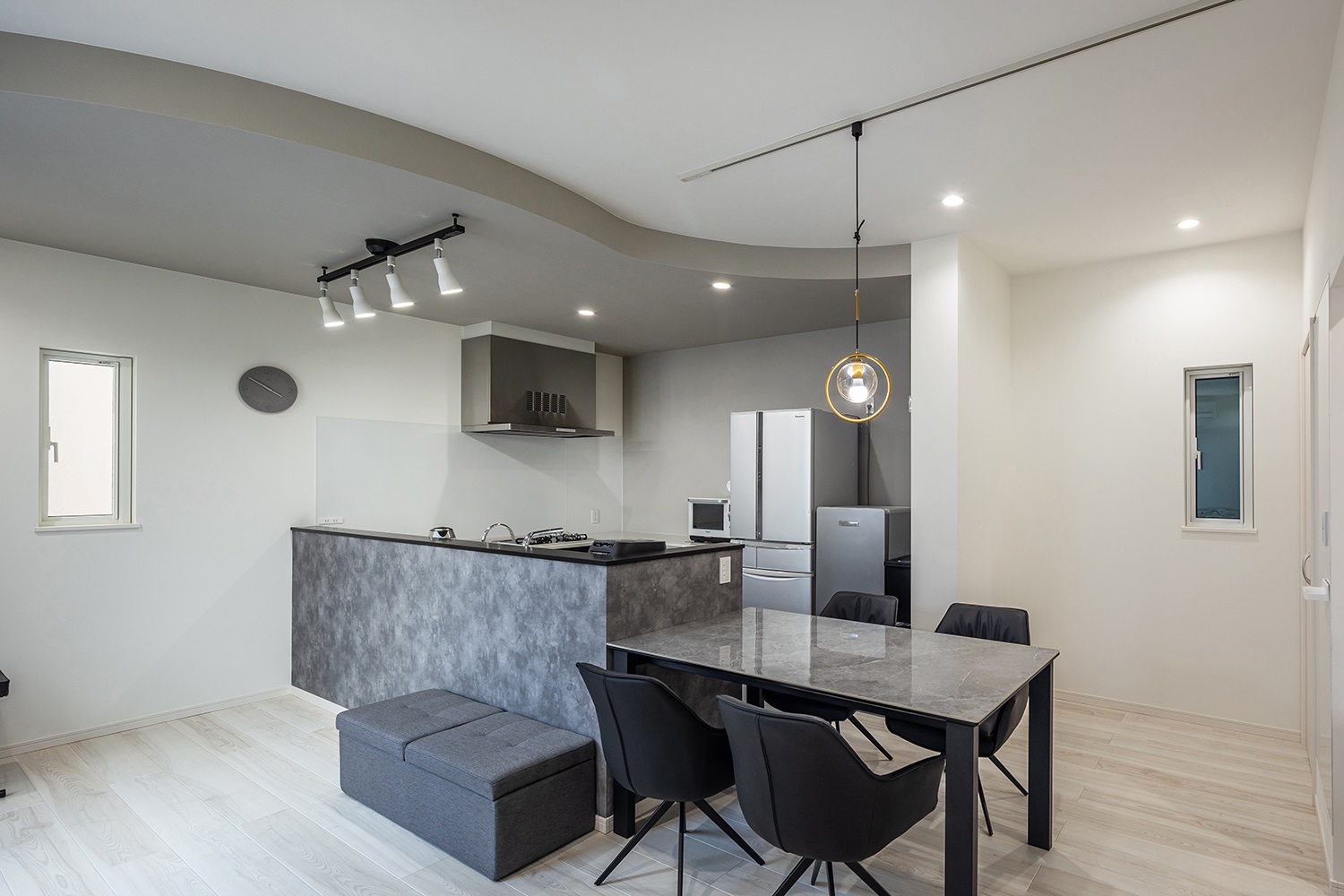ダークグレーのフロアタイルとスタイリッシュなダクトレールライトが、空間にモダンで都会的な雰囲気を与えます。