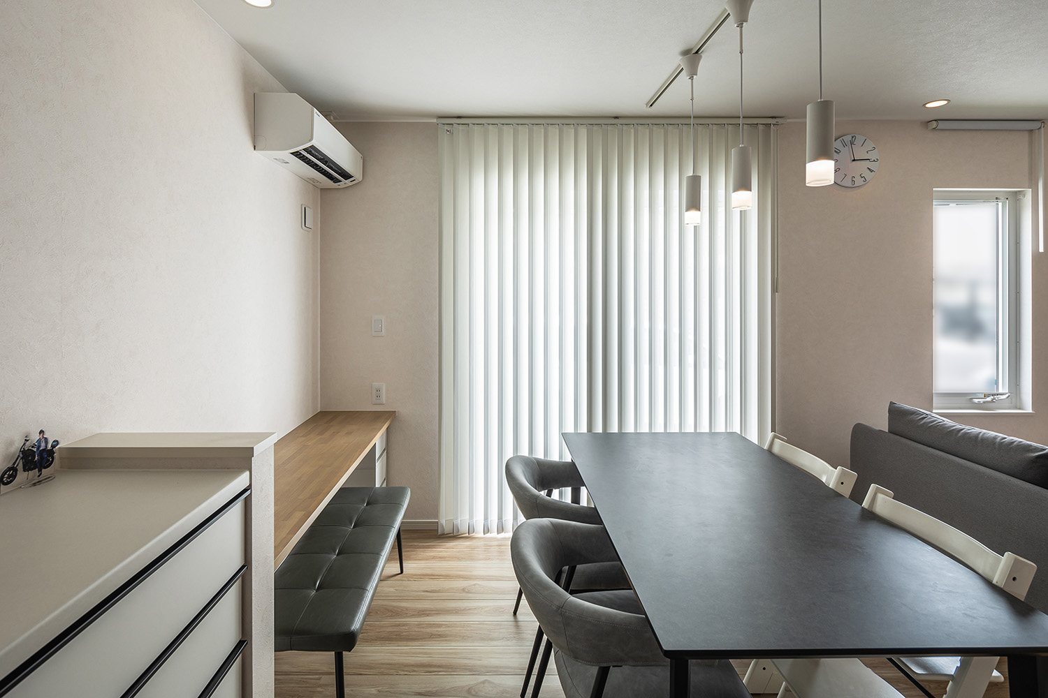 ペンダントライトとシックなダイニングテーブルの組み合わせが、洗練されたダイニングを演出します。