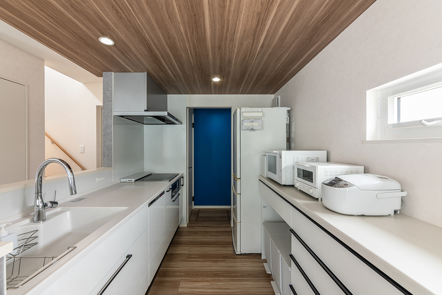 白で統一された清潔感あふれるキッチンは、青色のアクセントクロスとの組み合わせで、空間に心地よい遊び心をプラス。