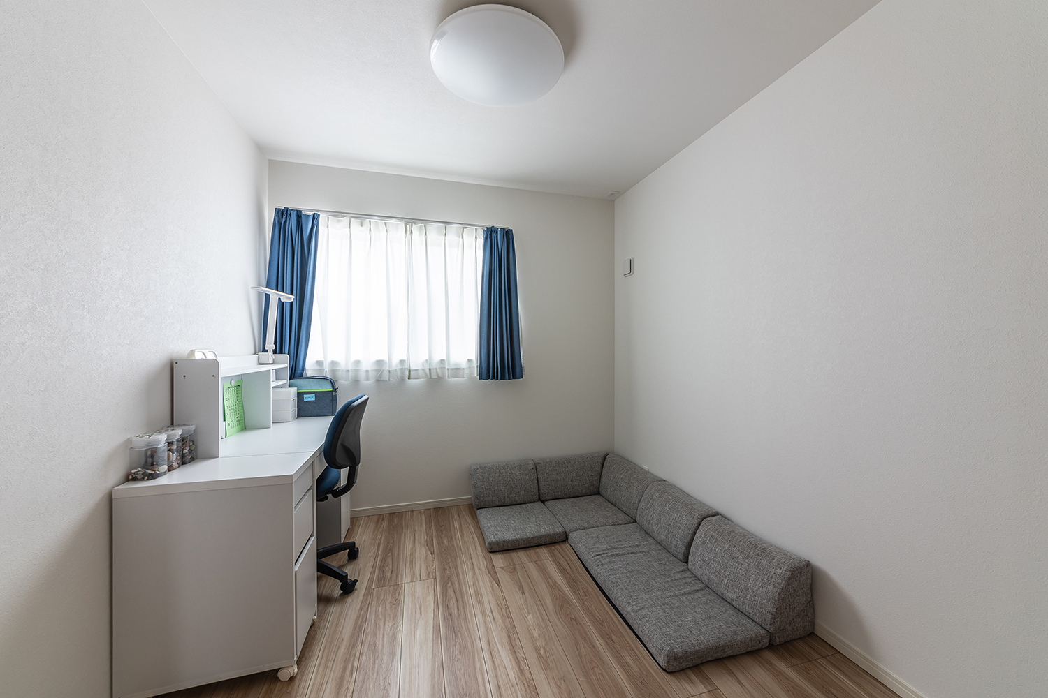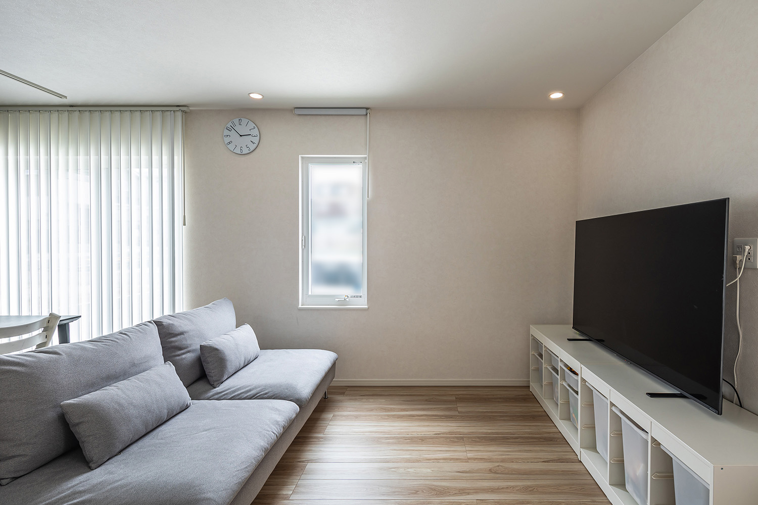 柔らかな光が降り注ぐリビングは、白色とグレーの家具で優しい雰囲気にまとめました。