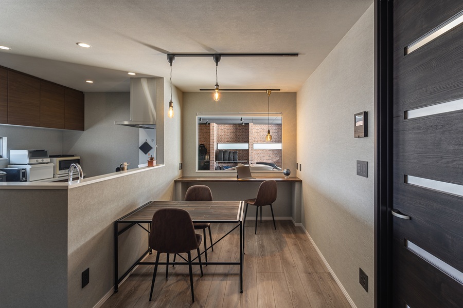 ダイニング奥の大きな窓はインナーガレージへと繋がっており、食事を楽しみながら愛車を眺めることも。窓の手前には造作のカウンターテーブルを設置。フレキシブルに活躍する万能なスペースです。