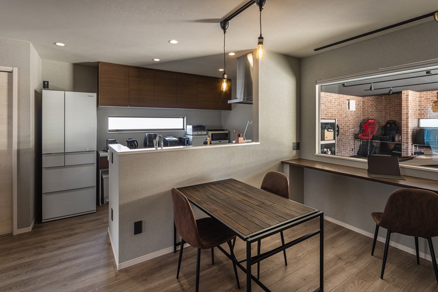 キッチンの対面に配置されたダイニングは、2灯のペンダントライトが優しく食卓を照らします。