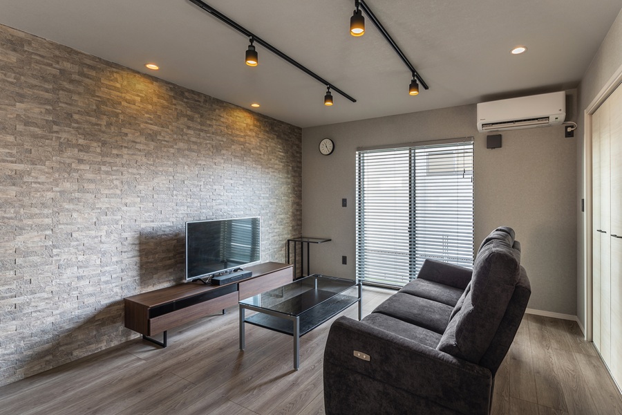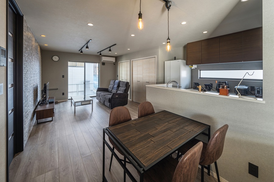 エイジング感のあるレンガ積み調のアクセントウォールが、天井の黒いスポットライトと絶妙にマッチ。ガレージの無骨な雰囲気と室内のモダンさが心地よく合わさった、こだわりの空間に仕上がりました。