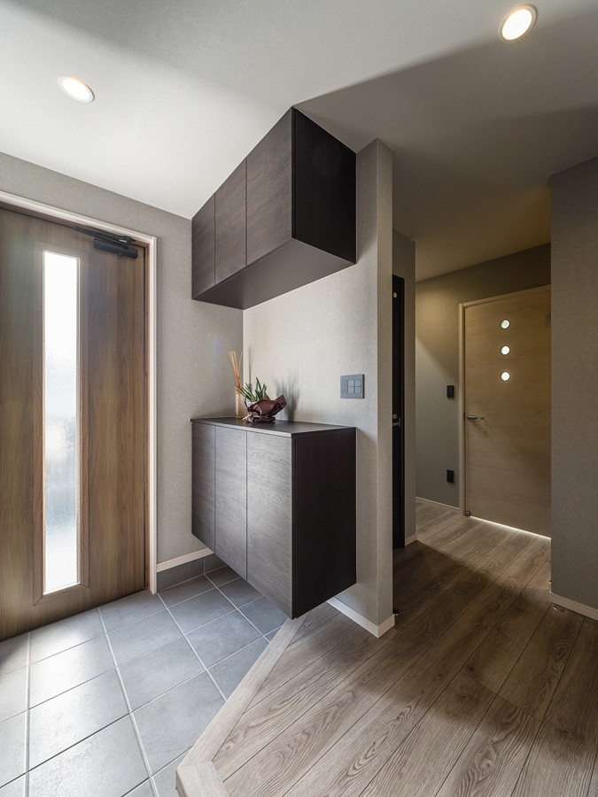 すっきりとしたシンプルモダンな玄関。シューズボックスやサッシをウォールナットで統一することで、空間全体に落ち着きと高級感をもたらしています。