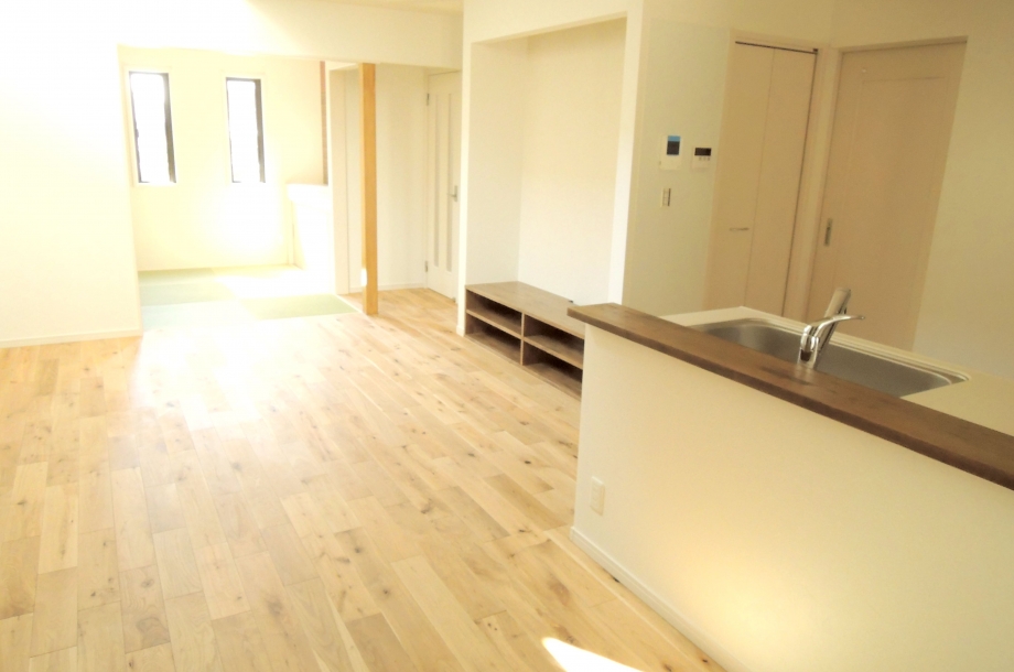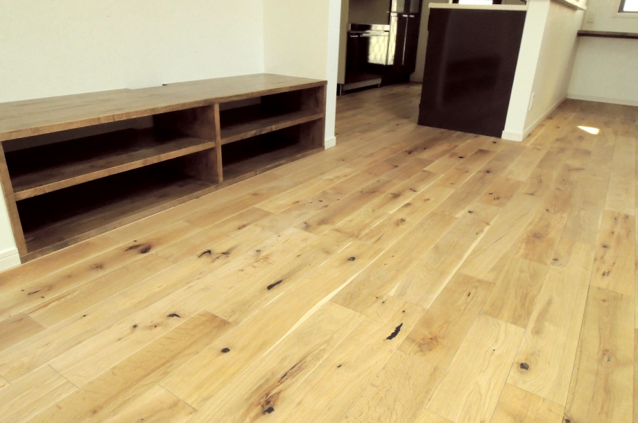 粗めの木目が特徴的なラスティックオークを使用した無垢材の床がカッコいいLDK。