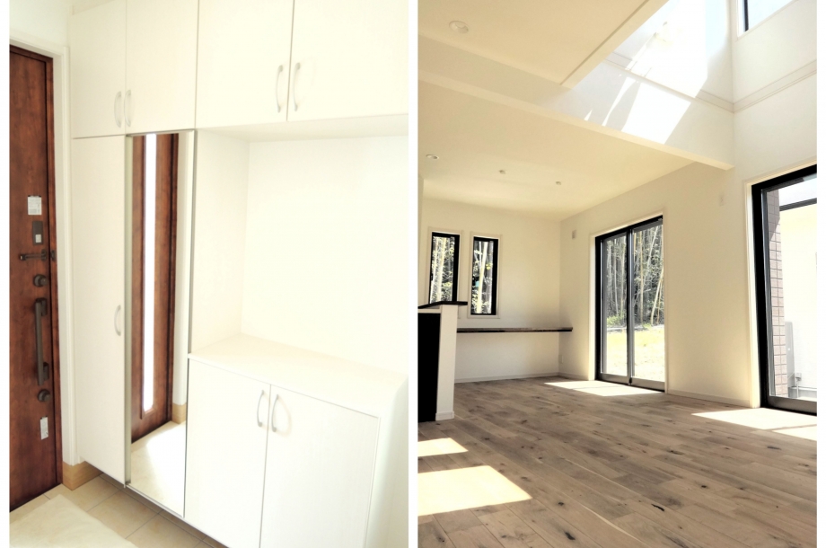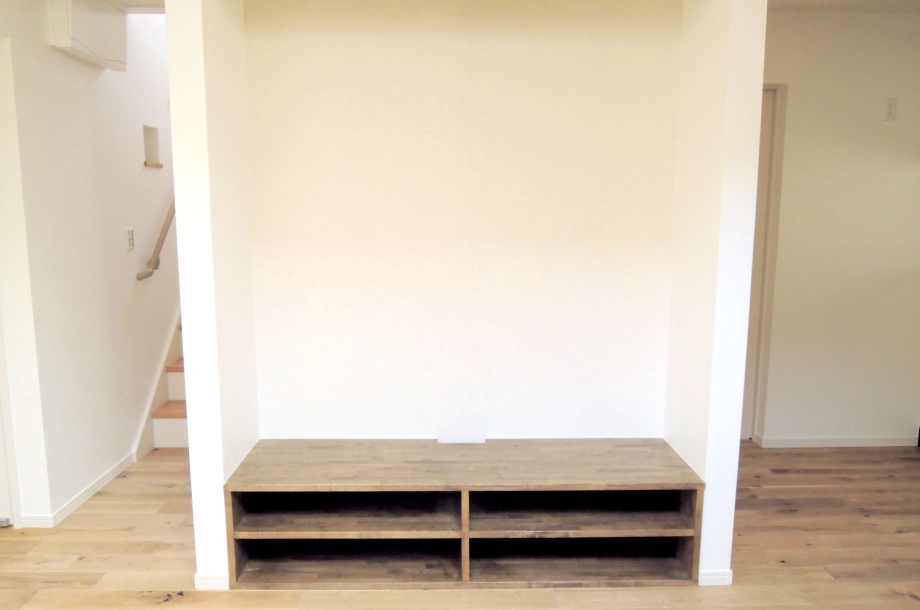 日当たり抜群の吹き抜けと無垢材を使った造作TVボードも素敵です。