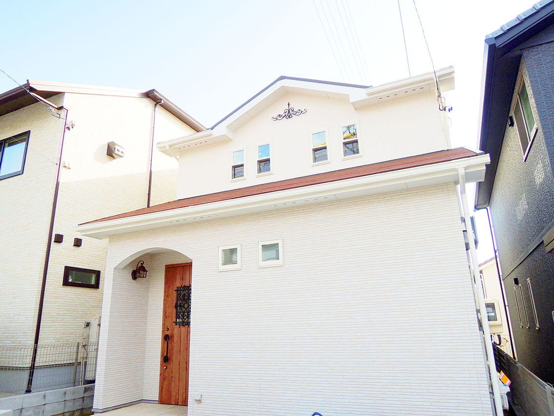 北側接道の土地を選ぶことでカフェテイストのおしゃれな外観を維持しつつも、南側にしっかりと太陽光パネルを配置できています。